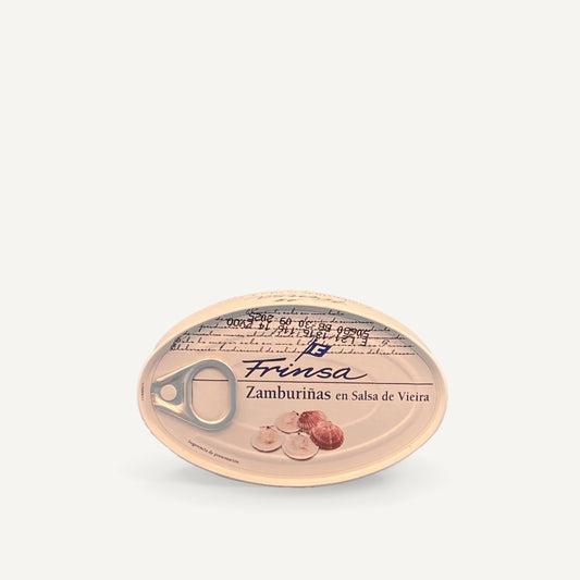 ZAMBURINES À LA SAUCE VIERA. Saveurs de la tradition galicienne Emblème de la gastronomie galicienne et icône du Chemin de Saint-Jacques. Ces coquilles Saint-Jacques fraîches et extraordinairement tendres proviennent des estuaires galiciens et sont sélectionnées manuellement pour obtenir les meilleurs spécimens. La délicieuse sauce aux pétoncles qui accompagne cette confiture est élaborée selon la recette traditionnelle. Saveur authentique de Galice en canette ! Producteur : Frinsa